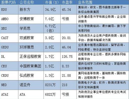 目前已经或即将在美上市(学而思(XRS,%)2010年10月20日挂牌交易)的中国教育类企业共有10家公司,基本情况如下表所示: