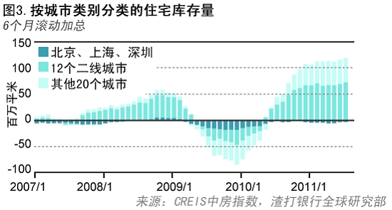 图3注:一线城市包括北京、上海、深圳;12个二线城市包括重庆、杭州、南京、天津、大连、广州、苏州、厦门、成都、武汉、长沙和西安;20个三、四线城市包括沈阳、郑州、汕头、佛山、东莞、无锡、镇江、合肥、太原、青岛、南昌、唐山、长春、海口、包头、哈尔滨、徐州、福州、南充和宁波。这35个城市住宅销售量占到全国销售总量的约50%。