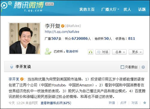 创新工场董事长李开复微博截图