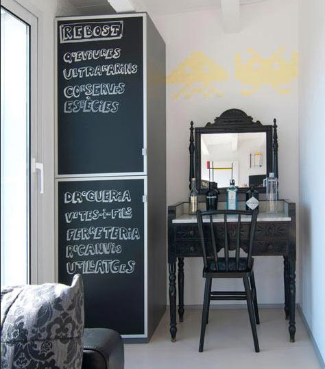 左边的柜子是深色的,式样很简单。上面有一层石板,所以可以在柜门上写字,也很容易擦掉。这幅照片里面,柜门上的字就是他们放在里面的东西:食物,香料,工具,清洁用具……右边的梳妆台是Anna的曾曾祖母的,已经有一百多年的历史了,现在是他们的酒吧。他们用即时贴在墙上贴成了太空入侵者(Space Invaders)的形状。