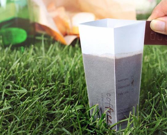 这是一个便捷式咖啡袋,它折叠成一张纸,里面装有咖啡粉,当你需要喝咖啡的时候可把纸片拉成一个杯子状,然后倒进热水,用撕下来的密封条做搅拌的棍子,一杯香浓的咖啡就泡成了。这个咖啡袋是用可降解的生物材料做成的,所以不用担心会污染环境。