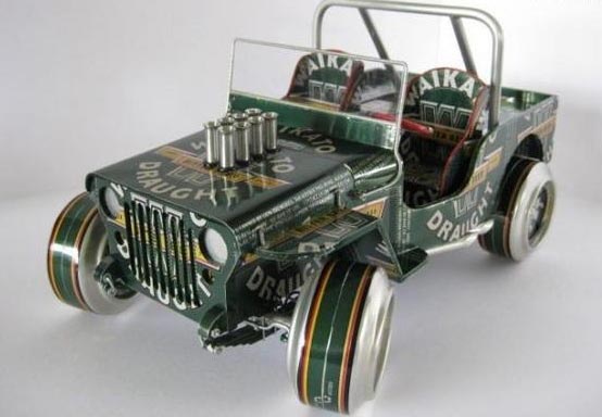 Sandy Sanderson是新西兰当地的艺术家,他的绝佳技巧就是把废弃的铝铁罐变成超酷炫的汽车。Sandy 在过去一直有规律收集铝铁罐来回收的习惯,当某一天他看着罐子并起仔细观察底部的形状和图案,“也许这可以拿来做一个很酷的轮子”。于是Sandy 开始了他的铝铁罐汽车创作。