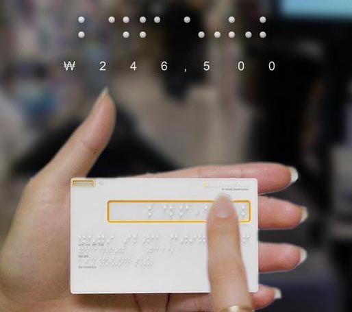 设计师Young-suk Kim设计了这款带扬声器的信用卡,除了消费金额能在卡上通过盲文显示外,盲人还可以通过聆听卡上左上角的扬声器的发声来作进一步的确认,这样就不担心被骗了。这款设计能给盲人带来极大的方便。