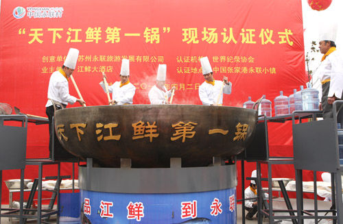 “天下江鲜第一锅”世界纪录在张家港市永联长江鲜美食节诞生,世界纪录协会在现场举行了认证仪式,千名游客共同见证了这一历史性的时刻。