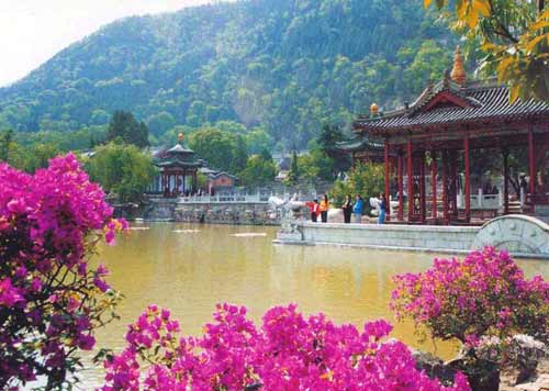 华清池大门上方有郭沫若书写的“华清池”匾额。进了大门就见两株高大的雪松昂然挺立,两座宫殿式建筑的浴池左右对称,往后是新浴池,由新浴池往右行,穿过龙墙便是九龙湖,湖面平如明镜,亭台倒影, 垂柳拂岸,湖东岸是宜春殿,北岸是飞霜殿为主体建筑,沉香殿和宜春 殿东西相对,西岸是九曲回廊。由北向南过龙石舫,再经晨旭亭、九龙桥、晚霞亭,便到了仿唐“贵妃池”建筑群。