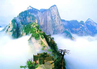 华山以其峻峭吸引了无数浏览者。山上的观、院、亭、阁、皆依山势而建,一山飞峙,恰似空中楼阁,而且有古松相映,更是别具一格。山峰秀丽,又形象各异,如似韩湘子赶牛、金蟾戏龟、白蛇遭难。峪道的潺潺流水,山涧的水帘瀑布,更是妙趣横生。并且华山还以其巍峨挺拔屹立于渭河平原。东、南、西三峰拔地而起,如刀一次削就。唐朝诗人张乔在他的诗中写道:"谁将依天剑,削出倚天峰。"都是针对华山的挺拔如削而言的。