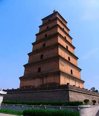 大雁塔是西安市的标志性建筑和着名古迹,是古城西安的象征。因此,西安市徽中央所绘制的便是这座着名古塔。大雁塔是楼阁式砖塔,塔通高64.5米,塔身为七层,塔体呈方形锥体,由仿木结构形成开间,由下而上按比例递减,塔内有木梯可盘登而上。每层的四面各有一个拱券门洞,可以凭栏远眺。整个建筑气魄宏大,造型简洁稳重,比例协调适度,格调庄严古朴,是保存比较完好的楼阁式塔。在塔内可俯视西安古城。