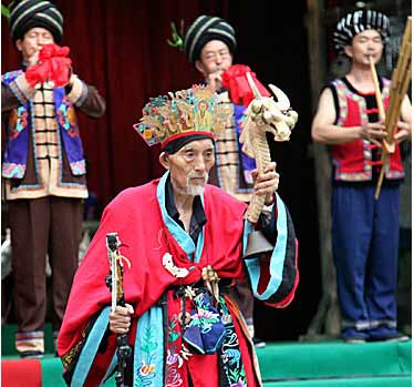 92岁的土家族老人正在表演“土家族梯玛神歌”