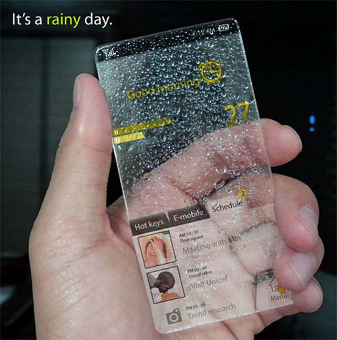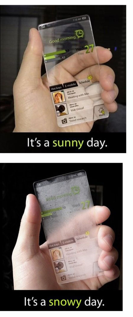 在屏幕未点亮的情况下,就宛如一块精心雕琢的“水晶”一样剔透。最让人惊奇的是,Window Phone可根据实时的天气状况改变整个手机屏幕的显示状态:若是下雨天气,整个手机都会表现出雨滴的效果;若是下雪天气,则会表现出白茫茫的霜雾效果;当天气晴朗时,它又会变回剔透的状态。设计师Seunghan Song就是想把它设计成一面玻璃窗,实时的呈现出雨、雪等各种美妙状态。