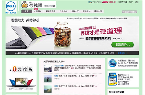 在戴尔存钱罐的活动主页上,时刻滚动着这样的话语。如果是你,会心动吗?将参与活动的每一次登陆、点击、转发等动作,都折算成零钱存到存钱罐里,许多人人网用户乐此不疲。
