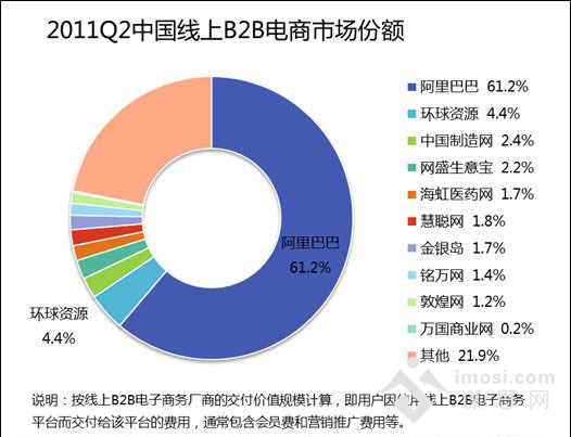据了解,根据易观国际数据显示,2011年第2季度中国线上B2B电子商务市场交付价值达到25.1亿元,环比增长13.2%。其中线上B2B电子商务市场付费帐户数为205.3万,环比增长5.0%。
