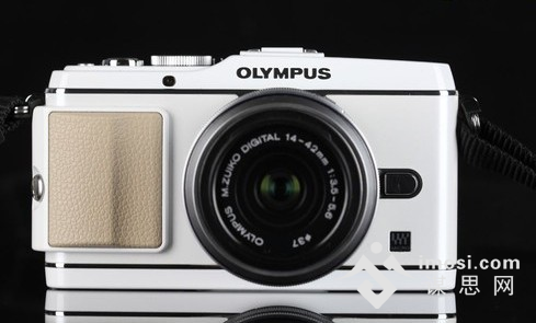 该机手柄部分有着较大的变化,手柄与机身并没有选择完美的融合在一起,而是整个凸出来了。需要提醒的是奥林巴斯E-P3的手柄部分的那块覆皮是可以拆卸和替换的。这也是为什么奥林巴斯E-P3在机身右侧有一个明显的金属螺丝帽。