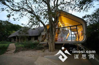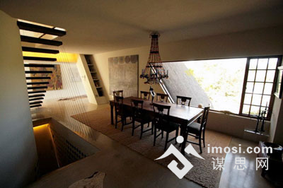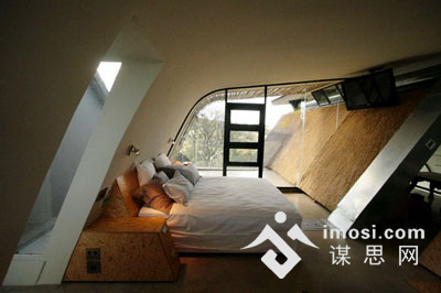该建筑位于一片密林之中,建筑师在材料的选择上保留了村舍以及周围环境原有的自然特色,以天然的木材为主。但这并不代表扩建的建筑风格就要沿用村舍原有的风格,大胆的建筑师将建筑的整体形式偏向现代动感的风格,但是却巧妙地跟原有的建筑相汇融合起来。设计师沿着建筑的长边设置了倾斜的平台,与包裹整个室内空间的钢制框架形成了鲜明对比。室外平台与新加建的卧室相连,两个空间通过弧形排列的竹棚融为一体,形成了极具穿透性的户外阳光房。