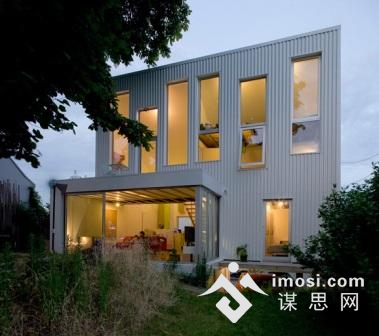 方案的设计是严格按照当地建筑规范进行的,别墅整体包含了一个两层通高的空间和一个向东面倾斜的屋顶。别墅的外立面包裹了一层白色金属面板,这个不规则的体量与街道的建筑有点分离的感觉。建筑向后腾出了一块停车区域,可以同时停放两辆车。在临街立面上设计了一系列小方窗,有些一直贯通到屋顶形成别致的天窗,这样可以让人不至于跟街道脱离。