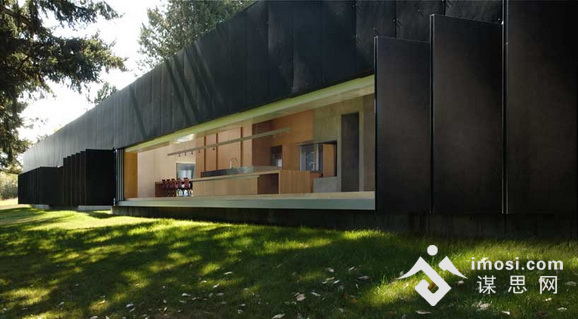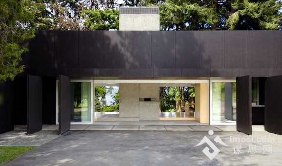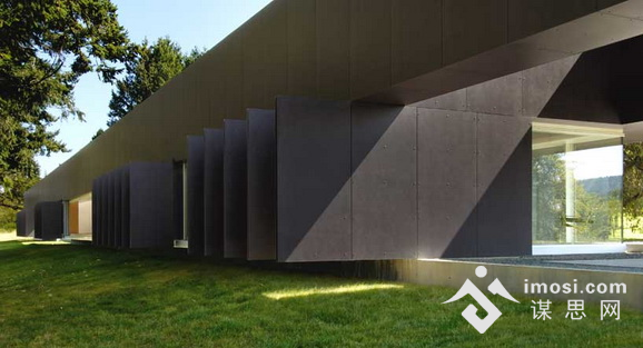这座深灰色的大胆的线性建筑和该地的密林环境形成很鲜明的对比。其主体建筑是一个单独而连续的形态,长度足足有276米,房屋面对着一排成熟茂密的杉树,不光可以有效地对屋子进行隐藏,并且还可以观赏到远处美丽的水景。