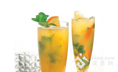 做法:将橙子和薄荷叶一起捣碎,然后加入西柚汁,用小勺充分搅匀后加入事先准备好的朗姆酒和柑曼怡力娇甜酒,最后加入切成小块的橙子和薄荷叶作为装饰。