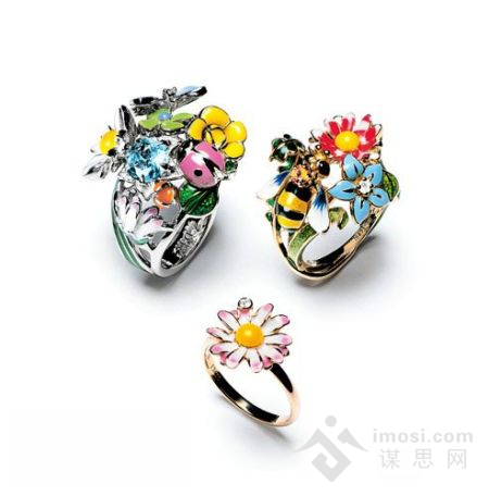 维克多也钟爱运用彩漆的装饰手法。彩漆具有沉着高雅的漆性,表面光滑反光,包容性高等特点,但在珠宝设计中出现实属罕见。维克多所用的彩漆由迪奥品 牌高级珠宝部门通过精湛复杂的技术和科学研发提炼而出。新型彩漆一改传统彩漆只有金色、红色、黑色等单一色调,而专门研发用于与各种贵重金属相匹配的色彩 搭配,它具有色彩艳丽、光泽度强,保存格外持久等优势。“食人花”系列中,鲜花、水果、昆虫,在设计师丰富的创意下,涂抹上闪亮、色彩过度自然的彩漆之 后,与各类宝石融于一体,演绎出充满现代气息的珍贵配饰又蕴涵着丰富的幽默感,灌注着珠宝设计的艳彩流光的鲜活生命力。