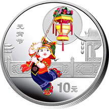 2004年发行的中国民俗――元宵节彩色金银纪念币,其背面图案均为儿童闹花灯和中国传统建筑造型。