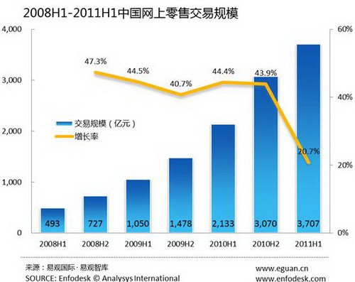 数据显示,2011年上半年网上零售市场的整体增长率已经出现下滑,环比去年下半年增长率下滑至20.7%。中国高速增长的网上零售市场将出现刹车。C2C市场的交易规模的增长速度将持续稳定,整体市场的增长将开始依靠B2C市场的增量。