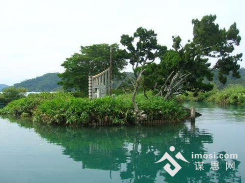 在日潭的尽头有个螃蟹状的建筑,那是发电场的厂房,旁边有几座水上人家,小小的船屋和山水画中一模一样,那种悠闲的感觉让人很想像陶源明一样隐居与此。绿水青山随着船移动的速度向后移动,好象一幅徐徐展开的水墨画,美不胜收。