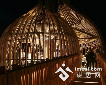 树屋餐厅建造在一棵高40米、直径1.7米的巨大红杉树上。它的外观像一个即将破茧而出的蝶蛹吸附在树上,又像童话世界里的森林巨人正在晾晒的洋葱头。入夜,精心设计的灯光把餐厅映照得玲珑剔透,颇像一盏中国灯笼,为夜归人引路照明。