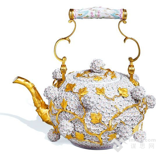图中这款“雪花球(Snowball Blossoms)”茶壶是梅森为了庆祝成立300周年而复制的特别款,应用了陶瓷艺术大师Johann Joachim Kaendler在1739年独创的“雪花球”装饰手法。Kaendler拥有惊人的才华,曾以当时不同阶层人士为原型制造出1000多种瓷偶,生动展示了18世纪欧洲的社会百态。Kaendler的皇室拥趸之一,普鲁士国王腓特烈大帝在1970年一口气订购了6只以“雪球花”手法烧制而成的花瓶。