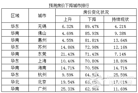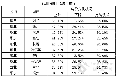 通过对比“预测房价下降城市排行榜”和“预测房价上升排行榜”,可以很明显看出,认为房价会下降的城市普遍集中于华东和华南两个地区,并切包括了主要的一线城市。华东和华南地区是我国经济最为发达的地区,这些地区由于人口较多,并且有大量外来务工人员及新增就业人口,使得对于房地产的需求量相对较大,导致房价水平远远领先于其他城市。而如此高比例的预测房价下降,除了基于客观现象的判断以外,也包含了当地购房者对于房价下降的迫切要求。而预测房价上升人数最多的几个城市,基本以华北和东北的二三线城市为主。与华东华南相反,这些地区由于原本房价相对较低,所以尚有较大的上升空间,另外,由于一些发达城市楼市政策愈发严厉,众多开发商也开始逐渐把目光集中能够到原本并不受重视的二三线城市,势必会带动当地的房价快速上升。