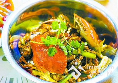香辣蟹选用产自绚甸、其以黑蟹为主料,皮薄肉厚、营养丰富。配以宋家祖传的秘制酱料精心炒制而成;菜品蟹壳金黄、蟹肉鲜嫩、浓郁的酱香和蟹香分外诱人,口味咸鲜,酱香、略带麻辣,可以根据客人的要求做成微辣、中辣、特辣三种味型。