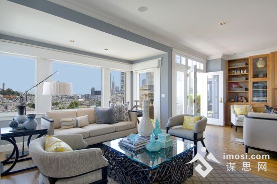 业主可以欣赏旧金山湾区的景色和城市胜景,包括Coit塔、海湾大桥、超美金字塔和阿尔卡特拉斯岛。现主人对住宅进行了重新整修。底层有带壁炉的起居室、图书馆、日光浴室、正式餐厅,都可以欣赏到东向景色。