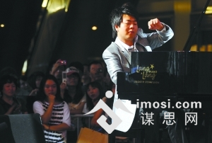 现场郎朗即兴演奏了李斯特的《叹息》和《钟》,虽然是在热闹的商场里表演,但不变的是他夸张的神情。
