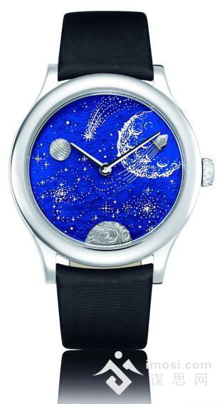 梵克雅宝的登月记,技法全面,采用两种以上的珐琅技艺。除了常用的围填法、掐丝法这些相对简单的技法外,在Dominique Baron主持下,梵克雅宝的珐琅表盘几乎使用了已知全部技法,其中在业内比较领先的技法有透底珐琅、透明彩色玻璃法、灰度绘和金丝绘法。