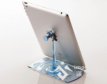 日本nendo设计事务所为elecom公司设计的第五个系列产品“jaguchi”(“faucet”或“tap”)是一款专为智能手机和平板电脑设计的支架。这个设计是用聚碳酸酯塑料和ABS水龙头部件制作的,在形式设计上,支架模仿了旧式水龙头的式样,水从水龙头里流出,在底部形成了一滩水湾。这个产品有多种颜色可供选择,包括透明色、蓝色、黑色和白色。