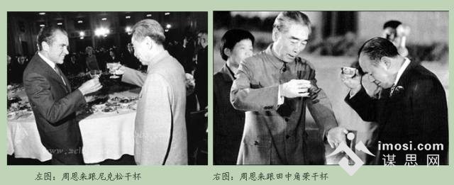 茅台的现今地位,或许取决于首席广告师周恩来的卓越努力。正是基于周的个人嗜好,茅台得以战胜四大白酒之汾酒、西凤和杜康,成为酒桌政治学中推动博弈、谈判、和解与交易的最高液体。酒量据说深不可测的周恩来,利用茅台款待外国宾客,展开酒桌微笑外交,风度翩然,开创本朝酒桌政治的伟大先河。周恩来用茅台款待基辛格、尼克松和田中角荣的照片,成为茅台外交的强硬证据,被广泛引用于各种历史记忆文献之中,令周氏外交散发出持久绵长的香气。