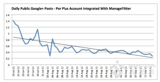 2011年7月19日至8月19日期间,每用户每日平均在Google+上发表0.68个公开贴(public post),而在2011年8月19日之9月14日期间,每用户每日平均在Google+上仅发表0.40个公开贴,降幅为41%。