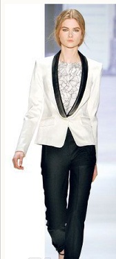 特别推荐颜色黑白、廓型简约的款式最易于搭配,拼接在袖口和领口的精致蕾丝细节,让硬朗的西装外套更加女性化。