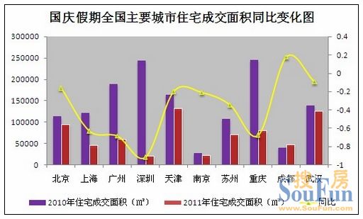 其他重点城市的国庆开盘数据也不乐观。国庆期间南京尽管21家楼盘推出了三千套新房源,但成交量依然低迷。住宅成交仅196套,同比下跌34.45%。其中黄金周最后一日商品住宅成交套数最高,为65套,而在10月3日,商品住宅成交仅为13套。业内人士称“金九银十”的楼市成色明显不足,商品房库存量节节攀高。