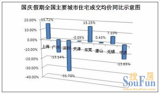 从全国重点城市国庆期间成交均价抽样调查来看,一线城市价格松动明显,成交均价普遍下跌,其中深圳跌幅最大,达31.7%,而上海成交均价不跌反升,涨幅为15.72%。