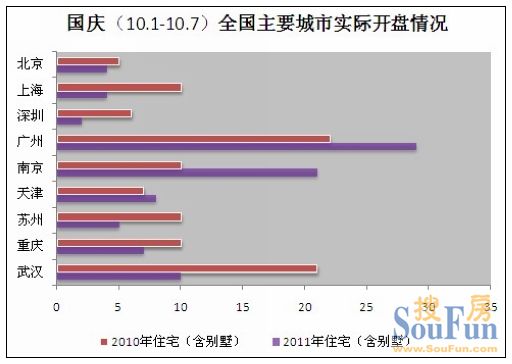 搜房网数据监控中心统计:全国9大重点城市2011年国庆总开盘数90家,同比下跌10.9%(2010年国庆开盘101家),其中南京、广州和天津同比上涨,其他城市均有不同幅度下跌。