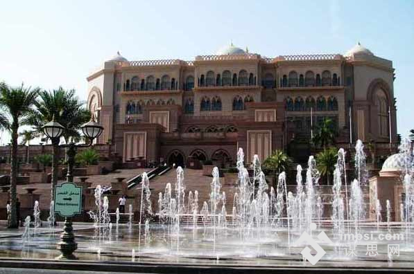 阿布扎比着名的八星级酒店——酋长宫殿酒店位于阿布扎比海滩,北面和西面临海,是一座古典式的阿拉伯皇宫式建筑。这是又一座金碧辉煌的阿拉伯建筑,它以40吨黄金打造集酒店与议会大厦的功能为一体,再次体现了阿拉伯皇族的富贵与华丽。