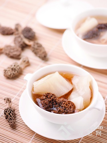 野生羊肚菌炖花胶:足足炖够2个半小时的老火炖汤将羊肚菌的奇香,瘦肉汁的鲜、花胶的清巧妙的融汇一起。肉汁鲜甜,更好地衬托出了羊肚菌的香郁,而花胶清甜细腻,又不会喧宾夺主。荤与素,浓与淡的结合,恰到好处,好一道滋补养颜的靓汤水。羊肚菌是天然稀有的珍品,具有补肾、壮阳、补脑、提神的功效,同时可防癌、抗癌、预防感冒,增强人体免疫力。