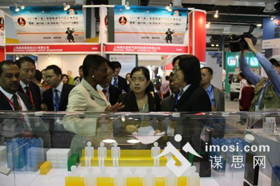 湖州神泰(上海南徐)总经理赵英慧向联合国副秘书长阿莫斯一行介绍相关展品