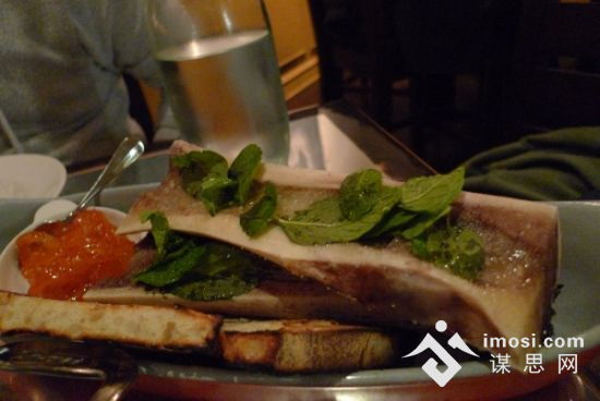 我一直觉得酒鬼们发明的这种“劈骨舀髓”的方法极妙,且更为豪放,但从来没有尝试过。那天中午吃了Osso Bucco,敲骨吸髓了一回,没想到晚上还如愿以偿地吃到了“劈骨舀髓”。这只能总结为:一、纳帕是个好地方;二、那一天应该算是我的食髓知味日,吃到了一堆与骨髓有关的美食。同样是在凯勒主理的餐厅,距离Bouchon几步之遥的ad hoc,这家名字有趣的小馆子(ad hoc是“临时”的意思)当天晚上供应整根的香烤大骨棒。且这吃法看起来跟中国酒鬼们的最爱不谋而合,骨头纵向劈开,你可以看见中间的被烤得晶莹又浓稠的骨髓。我一时贪心,舀了一大勺空口吃下,顿觉“被脂油蒙了心”,又油又咸,把我胸腔给堵了个结结实实,连灌了好几口红酒才缓过来。这才看到盘子一边斯斯文文放着的烤吐司片和金橘酱。所以合适的吃法是把烤得滚烫又油汪汪的骨髓抹一点在吐司上,再配上一点酸甜清新的金橘酱,细嚼慢咽。因为真正的酒鬼们都是从长计议的,这一根大棒骨可要佐下一瓶黑皮诺呢。