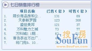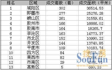 本随着岛城有部分开发商为试探市场对价格小幅松动,多个楼盘涌现抢购风潮。搜房网数据监控中心统计,继上周(10.10-10.16)共成交2106套后,本周(10.17-2011.10.23)成交1936套,尽管环比下跌8.07%,但是仍然维持在历史成交高位,本周总成交面积193680.74平米,环比下跌6.00%。本周城阳区夺得区域成交排行榜冠军,即墨市和崂山区分别名列排行榜第2名和第3名。