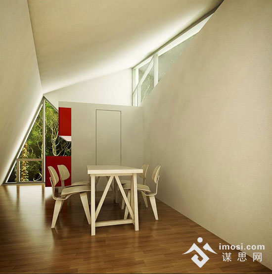 这座建筑是为一名芬兰艺术家设计的,建筑师参考了当地气候、文化和业主的建议,最终设计了这个形态。建筑的剖面是八边形的四分之一。体量从建筑前端逐渐变大,形成了两个相对独立的不同区域。较大的房间呈正方形,里面布置了上层卧房和下层中心工作区,工作区朝向一个细长的三角形户外平台。