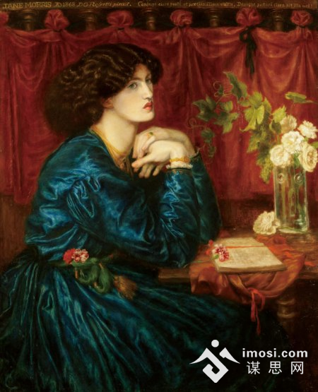 但丁·伽百利·罗塞蒂,《身穿蓝色真丝长裙的简·莫里斯》(Dante Gabriel Rossetti,Jane Morris, la robe de soie bleue )油画,1868。