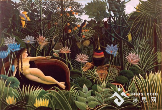 热带丛林是卢梭最喜欢描绘的主题之一。其实,画家一生不曾离开法国。也许,单调的生活更能滋养天才的想象力,画家脑海中的珍禽猛兽和奇花异草反倒比真实的更加鲜活。据说卢梭一定要开着窗子才能作画,因为葱郁的花草会让他感到窒息!《梦》是卢梭最后一幅作品,裸体的女人斜卧在长沙发上,硕大的艳丽的花朵围绕着她,狮子瞪着惊讶的眼睛,打量着窥探丛林的视线。在朗朗如日的月光下,一切都显得快乐、富饶、生机勃勃。当时,卢梭正在恋爱,梦中人与梦中景完美结合在一起,寄托着他的希望和幸福。这是一个仲夏夜的旖旎的梦。