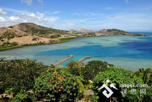 斐济是南太平洋上靠近新西兰的一个岛国。浅浅的海水漫过了珊瑚礁,湮没了沙滩,环绕着小岛。灿烂阳光照射在海水上,呈现晶莹的淡蓝色,如一条条蓝带般洁净,更像一块块翡翠般璀璨,镶嵌在葳蕤山林的小岛周围。