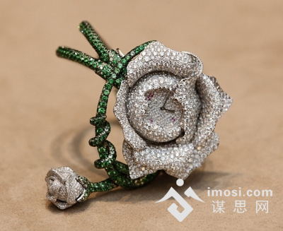 整枚La Rose腕表共镶有3190颗宝石(约重46.5克拉),其中包括5颗蓝宝石、145颗绿橄榄石以及1965颗钻石;1075颗tsavorites沙弗莱石镶砌而成。表面同样镶上宝石,与整枚腕表吻合得天衣无缝,恍若在佩戴者的眼前雕造出一幕童话国度的幻景。La Rose腕表是另一件堪当冠上积家之名的卓越定时器具,因为它在登峰造极的美艺以外,配备了积家846型机械式手动上炼机芯;机芯之外,是一个精致的镀铑白金表壳,而上炼表冠则高明地隐藏于表盘下,保持腕表的瑰丽美感。