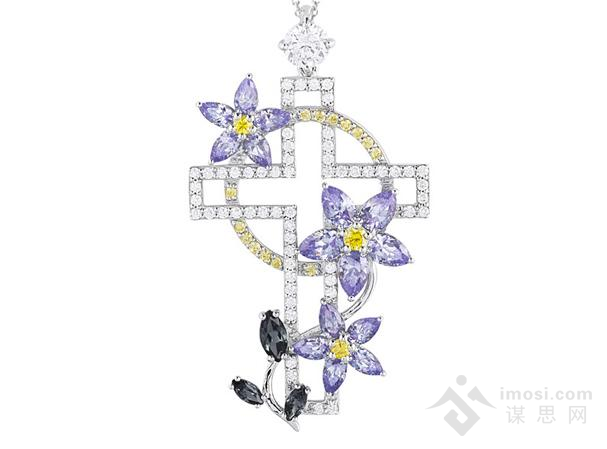 Amor是西班牙语的“爱”,Amor十字架吊坠加入花朵元素,令线条简单的十字架更具丰富层次。以71颗圆形晶钻勾勒十字架外框,中间以黄色晶钻组合成天使光环,深绿色及熏衣草色晶钻组成藤蔓与小花,穿越于十字架之间,代表以“爱”抱拥世界。