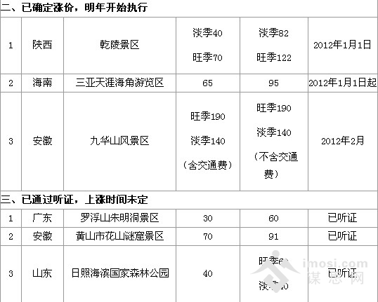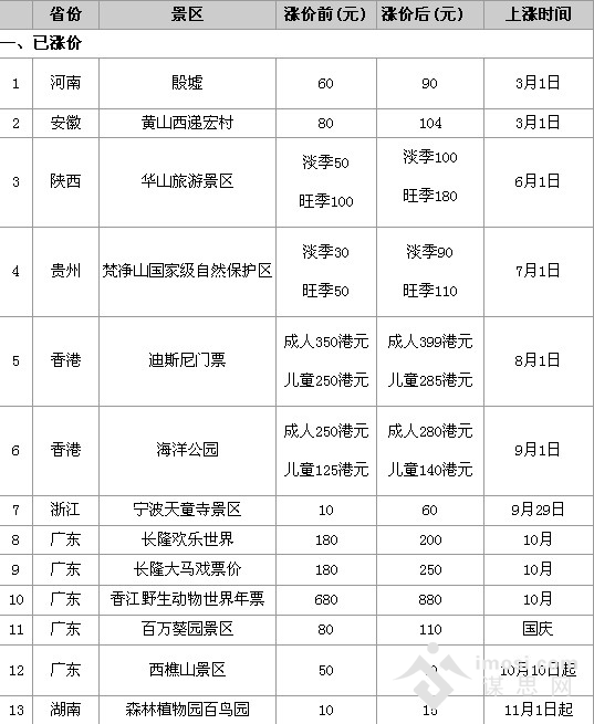 下面是对2011年门票已经涨价景区和明年即将涨价景区的盘点: